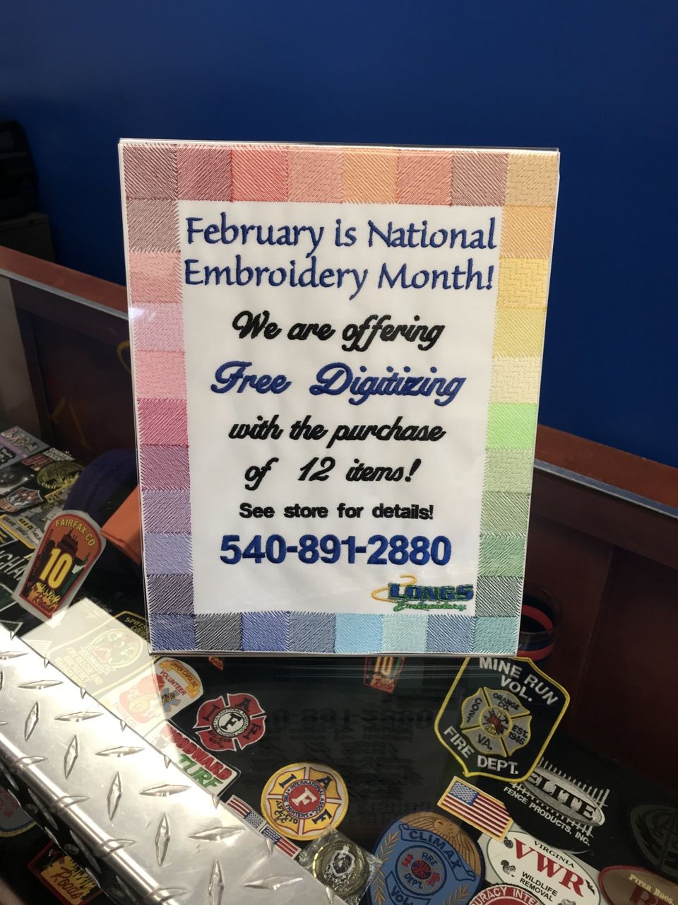 February is National Embroidery Month! For the whole month of February, Longs Embroidery, Inc is offering Free Digitizing with the purchase of 12 items. Those 12 items must get the free digitized logo embroidery as a left chest or cap design. Large back designs we are giving 50% off on.